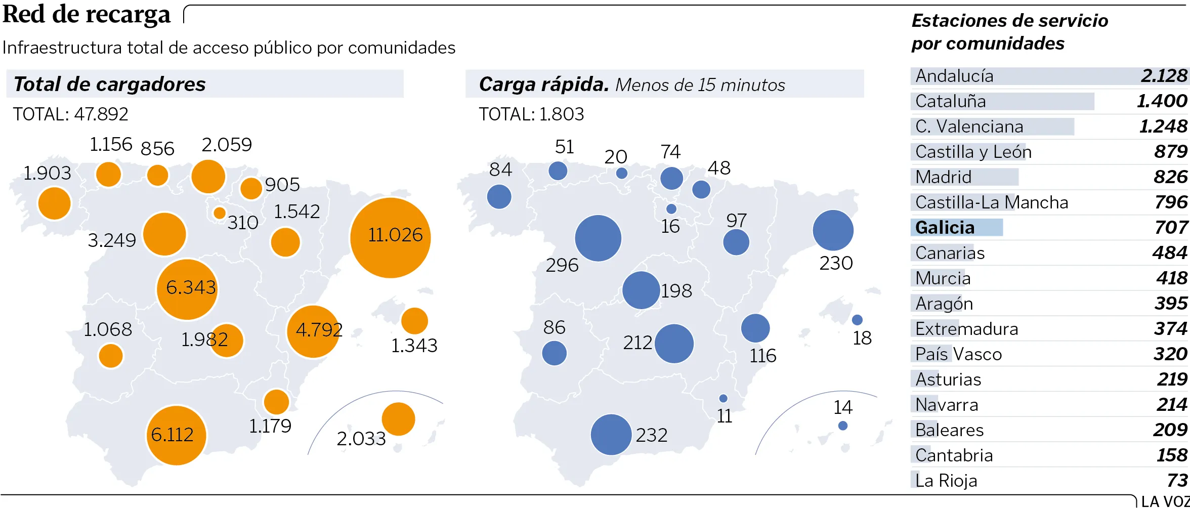 El mercado de coches eléctricos, poco a poco, se va afianzando en nuestro país y en nuestra comunidad, de hecho, uno de cada 5 coches vendidos en la comunidad gallega durante este período fueron eléctricos. Según un artículo publicado el pasado 06/09/2025 por el periódico «La voz de Galicia», a la par que crece la venta de este tipo de vehículos, crecen los puntos de recarga eléctrica, que ya duplican en número a las gasolineras. Así, la red de estaciones de servicio en España alcanza un total de 12.631 puntos de venta, de los que 703 están en la comunidad gallega, según la Asociación de la Industria del Combustible de España (Aice), antigua Asociación de Operadores Petroliferos (AOP). Esta cifra representa un incremento del 2,31 % respecto al año pasado. La mayor parte del crecimiento volvió a concentrarse en la categoría de operadores independientes, que sumaron 298 nuevas instalaciones.